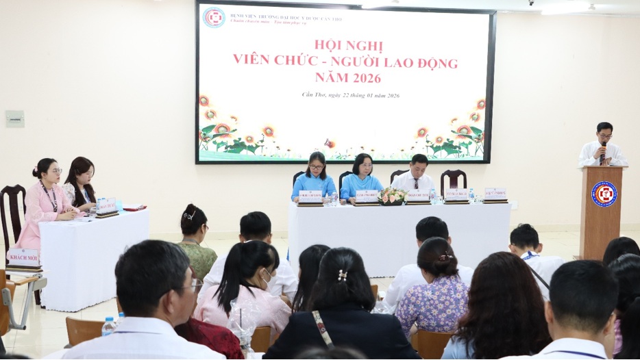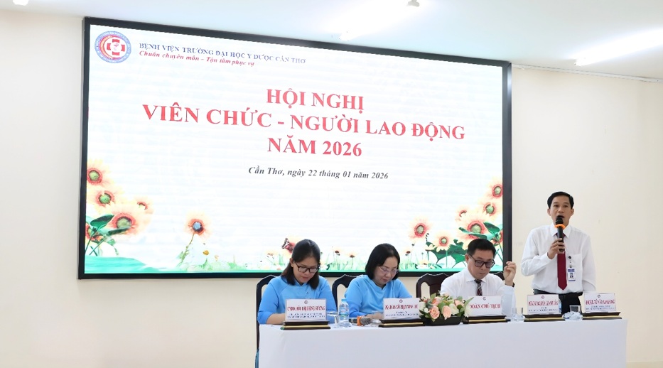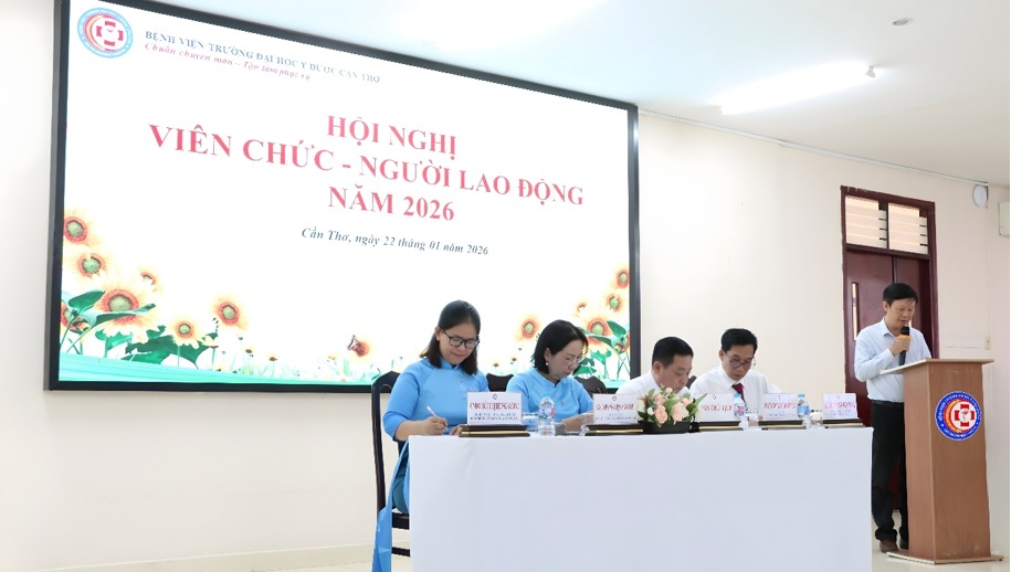 Chiều ngày 22/01/2026, Bệnh viện Trường Đại học Y Dược Cần Thơ đã diễn ra Hội nghị viên chức – người lao động năm 2026. Hội nghị được tổ chức nhằm phát huy tính dân chủ cơ sở. Đảm bảo quyền và lợi ích hợp pháp, chính đáng của viên chức, người lao động. Đồng thời tạo sự thống nhất, đồng thuận trong việc thực hiện nhiệm vụ của đơn vị.