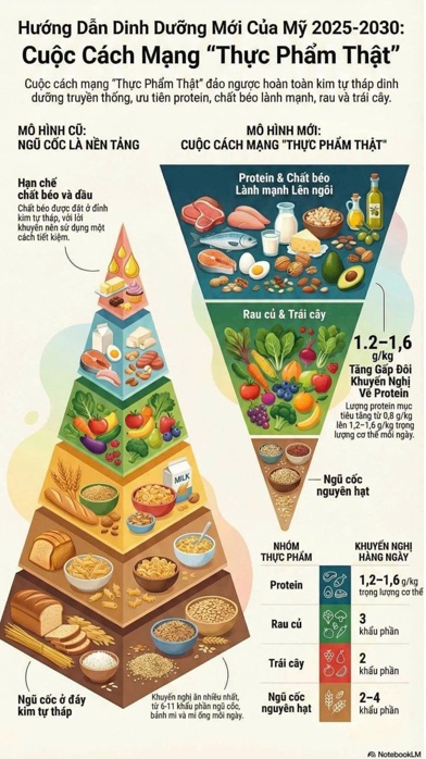 Hướng dẫn dinh dưỡng Hoa Kỳ giai đoạn 2025–2030 cho thấy xu hướng rõ ràng: chú trọng chất lượng thực phẩm, tăng vai trò protein, giảm đường và thực phẩm chế biến, đồng thời vẫn duy trì sự cân đối giữa các nhóm chất.