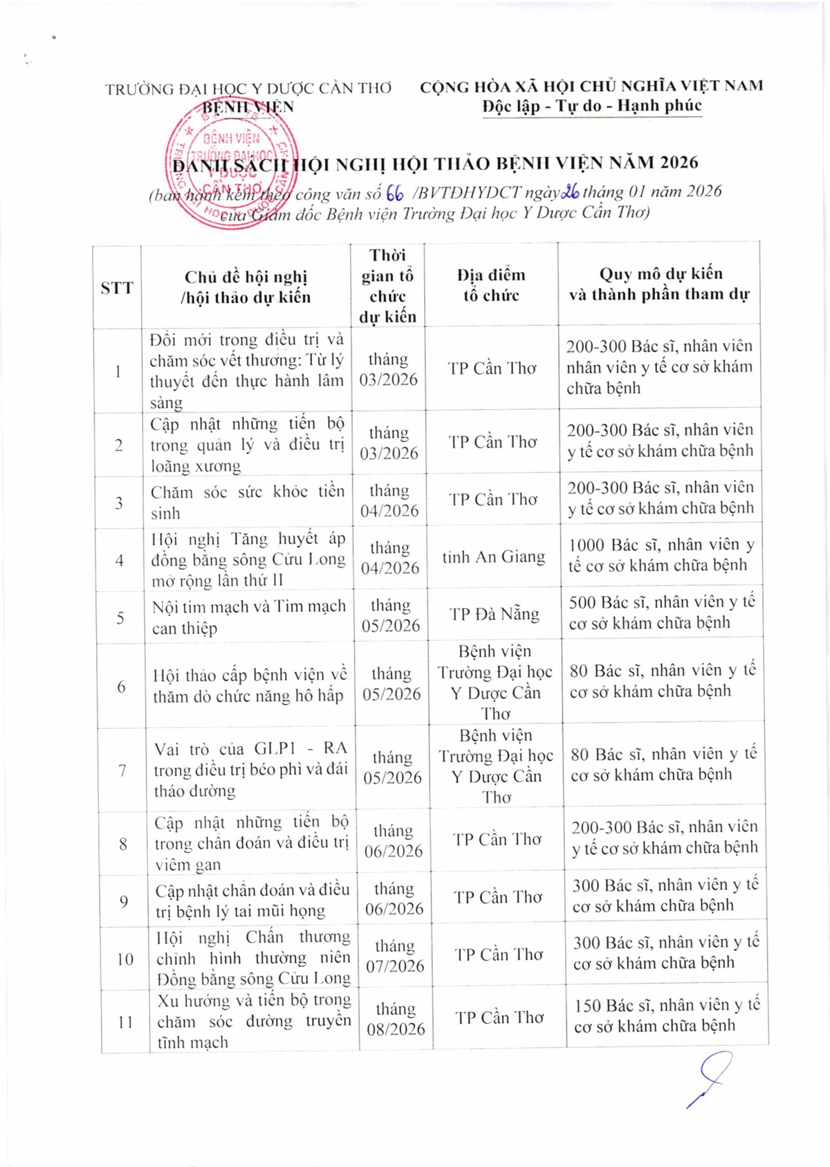 Với vai trò là đơn vị khám chữa bệnh – đào tạo – nghiên cứu trọng điểm tại khu vực Đồng bằng sông Cửu Long, Bệnh viện Trường Đại học Y Dược Cần Thơ luôn ưu tiên các hoạt động cập nhật kiến thức, chia sẻ kinh nghiệm lâm sàng và thúc đẩy đổi mới trong y học. Năm 2026, Bệnh viện dự kiến tổ chức chuỗi hội nghị, hội thảo khoa học với sự tham gia của các chuyên gia đầu ngành trong và ngoài nước. Chuỗi sự kiện có ý nghĩa đặc biệt với dấu mốc 15 năm thành lập Bệnh viện.