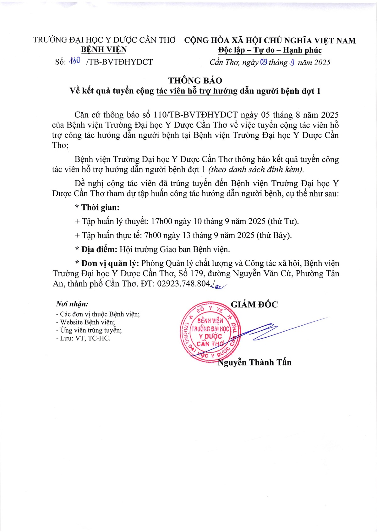 Thông báo số 142 về Kết quả tuyển viên chức năm 2025 của Bệnh viện Trường Đại học Y Dược Cần Thơ