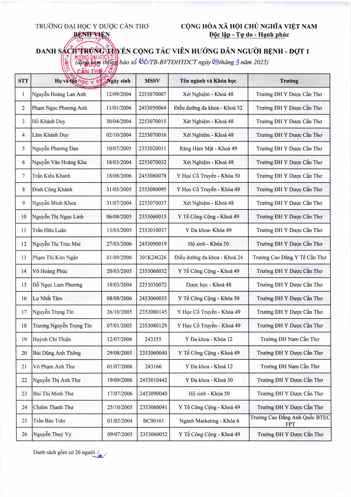 Thông báo số 153 công nhận kết quả trúng tuyển kỳ xét tuyển viên chức năm 2025 của Bệnh viện Trường Đại học Y Dược Cần Thơ