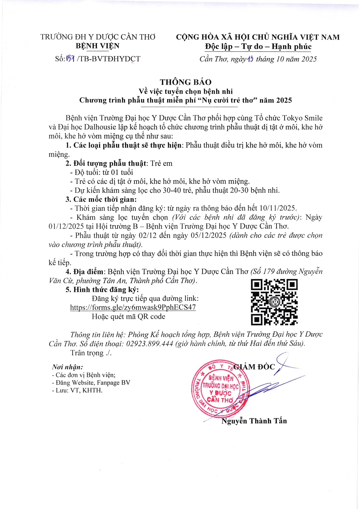 Thông báo số 157 tuyển chọn bệnh nhi chương trình phẫu thuật miễn phí "Nụ cười trẻ thơ" năm 2025.