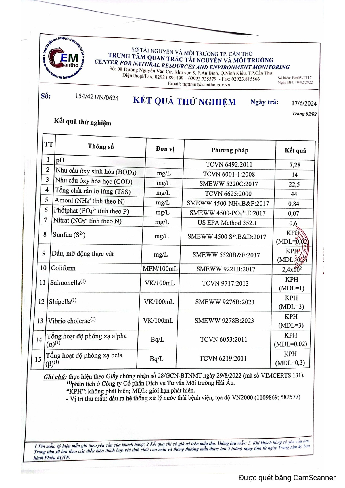 Kết quả quan trắc nước thải quý 2 năm 2024 của Bệnh viện Trường Đại học Y Dược Cần Thơ