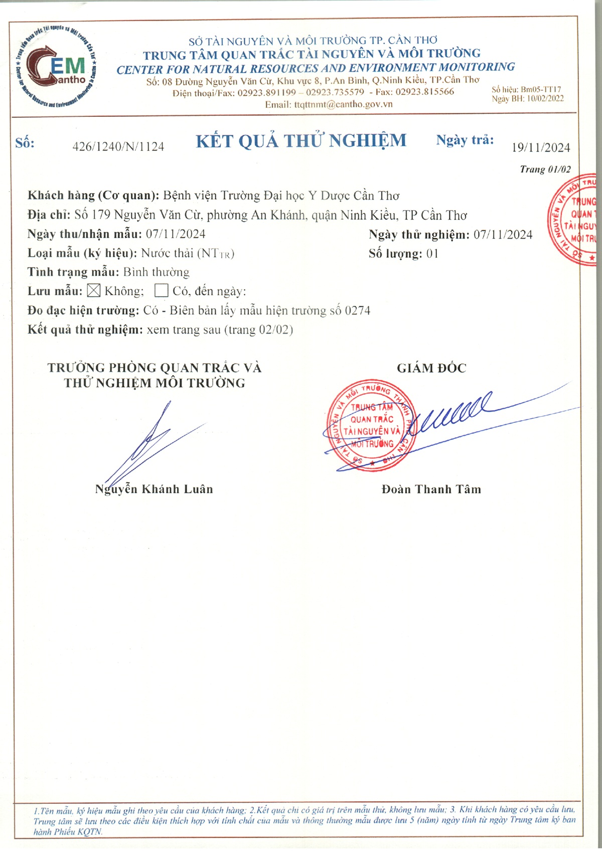 Kết quả quan trắc nước thải đột xuất năm 2024 của Bệnh viện Trường Đại học Y Dược Cần Thơ