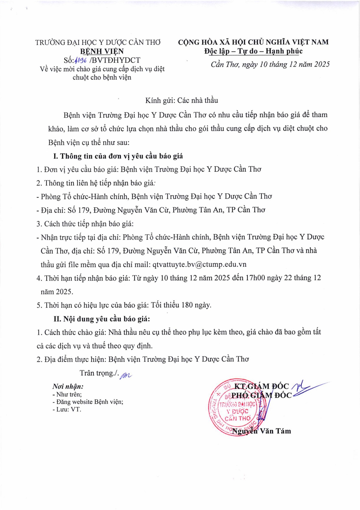 Về việc mời giá chào giá cung cấp dịch vụ diệt chuột cho Bệnh viện