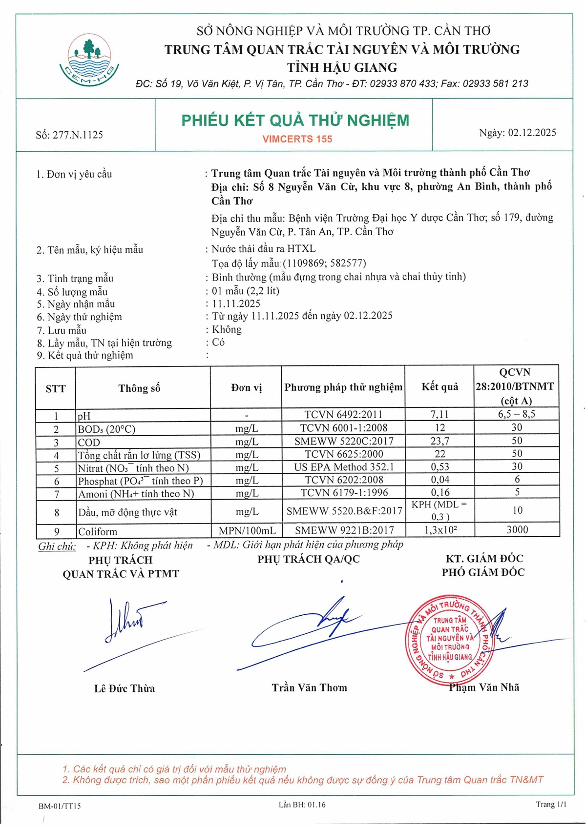 Kết quả quan trắc nước thải quý 4 năm 2025 của Bệnh viện Trường Đại học Y Dược Cần Thơ
