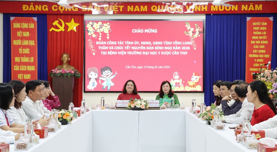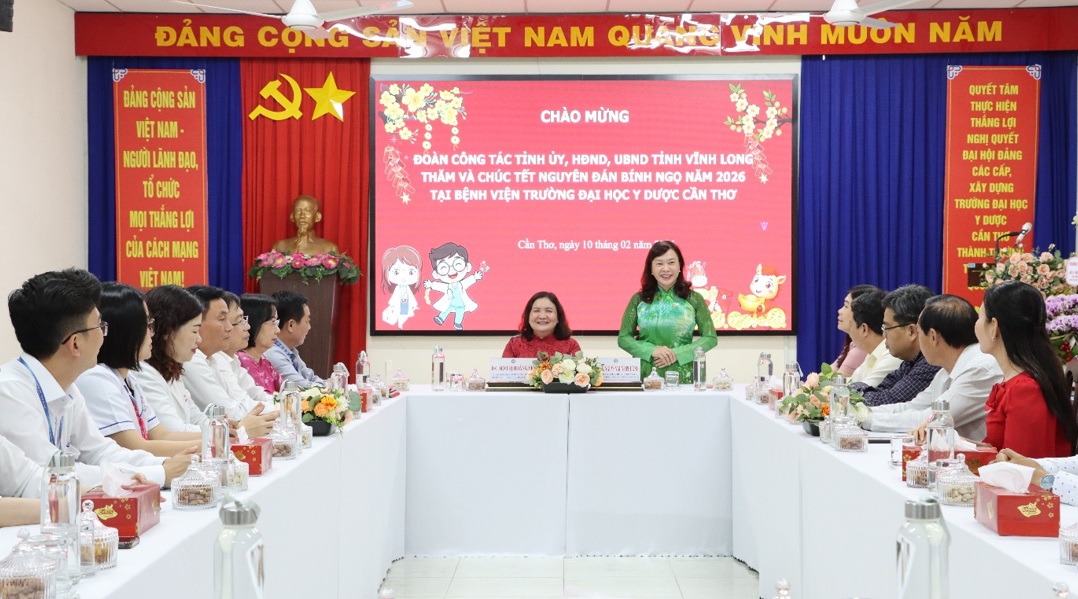 Chiều ngày 10/02/2026, Bệnh viện Trường Đại học Y Dược Cần Thơ rất vinh dự được đón tiếp Đoàn công tác Tỉnh ủy Vĩnh Long do đồng chí Hồ Thị Hoàng Yến, Ủy viên Ban Chấp hành Trung ương Đảng, Phó Bí thư Thường trực Tỉnh ủy làm Trưởng đoàn, cùng các đồng chí là đại diện Hội đồng nhân dân, Ủy ban nhân dân và các sở, ban, ngành của tỉnh đến thăm và chúc Tết Nguyên đán Bính Ngọ năm 2026 tại Bệnh viện.