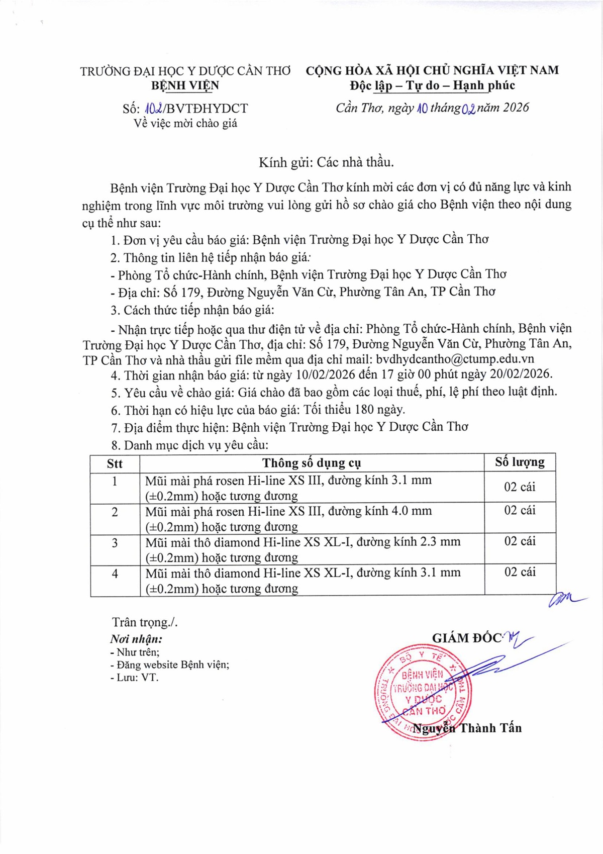 Về việc mời chào giá mua vật tư y tế tiêu hao cho máy rửa khử khuẩn của Bệnh viện