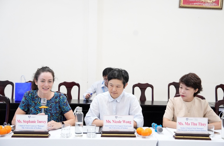 Đoàn chuyên gia đến thăm và làm việc gồm bà Nicole Wong – Trưởng nhóm Hỗ trợ Thử nghiệm lâm sàng, Đại học Sydney, bà Stephanie Toovey – Quản lý Hợp đồng Thử nghiệm lâm sàng, Đại học Sydney, và ThS. Ma Thu Thủy – Phó Giám đốc Đơn vị thử nghiệm lâm sàng, Viện Đại học Sydney Việt Nam.