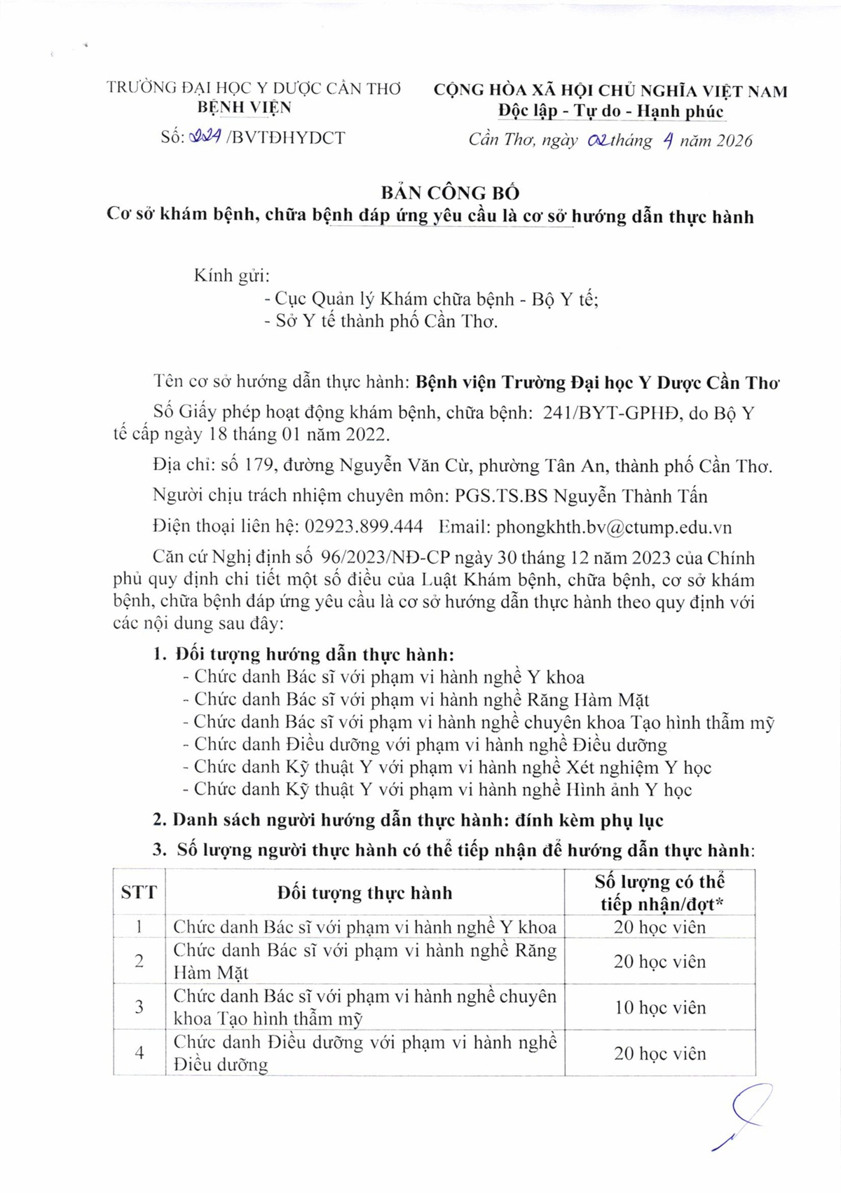 Bản công bô cơ sở khám chữa bệnh là cơ sở thực hành