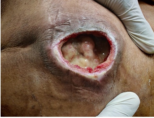 Bệnh nhân nữ, Diệp Thị T., 72 tuổi (quê quán Bạc Liêu), sau thời gian điều trị tại khoa Hồi sức tích cực do viêm phổi trên nền nhiều bệnh lý mạn tính như tăng huyết áp, đái tháo đường và bệnh tim thiếu máu cục bộ. Sau khi tình trạng nội khoa ổn định, bệnh nhân được xuất viện. Tuy nhiên, do phải nằm bất động kéo dài, bệnh nhân xuất hiện vết loét vùng cùng cụt và phải nhập viện trở lại. Khi vào viện, vết loét đã tiến triển sâu, có dấu hiệu nhiễm trùng rõ với dịch tiết đục, mùi hôi. Các đánh giá chuyên môn cho thấy tình trạng viêm nhiễm đang hoạt động mạnh, kèm theo sự hiện diện của vi khuẩn gây bệnh thường gặp ở vết loét da. Đáng lưu ý, bệnh nhân có nhiều yếu tố bất lợi cho quá trình lành thương như: