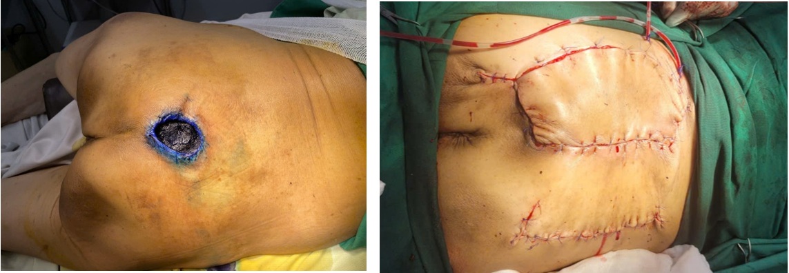 Giai đoạn che phủ vết loét: Khi vết thương đã sạch và tình trạng toàn thân cải thiện, ê-kíp phẫu thuật tiến hành tạo hình che phủ bằng kỹ thuật xoay vạt da Keystone. Sau khi xử lý triệt để tổn thương, khuyết hổng thực tế lớn hơn so với ban đầu. Các bác sĩ đã thiết kế và xoay vạt da tại chỗ để che phủ hoàn toàn vùng tổn thương, giúp bảo tồn mô lành xung quanh và đảm bảo nuôi dưỡng tốt cho vùng da ghép.