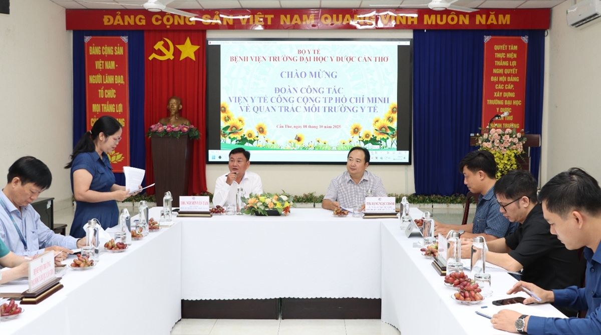 Thực hiện chỉ đạo của Bộ Y tế về việc tăng cường công tác quản lý chất thải y tế, vệ sinh môi trường, chủ động thực hiện công tác bảo vệ môi trường tại các cơ sở y tế. Thực hiện công văn số 468/VYTCC ngày 29 tháng 9 năm 2025 của Viện Y tế công cộng Thành phố Hồ Chí Minh về việc quan trắc môi trường y tế năm 2025. Sáng ngày 08 tháng 10 năm 2025, Bệnh viện Trường Đại học Y Dược Cần Thơ đã có buổi tiếp và làm việc với Đoàn Quan trắc môi trường y tế của Viện Y tế công cộng Thành phố Hồ Chí Minh về kiểm tra, đánh giá thực tế công tác quản lý chất thải y tế, vệ sinh môi trường, các hoạt động bảo vệ môi trường và kiểm tra công tác an toàn vệ sinh lao động tại Bệnh viện.