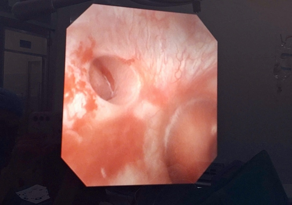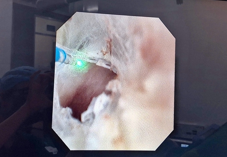 Bệnh nhân được chỉ định nội soi tán sỏi thận bằng ống soi mềm. Đồng thời, trong quá trình phẫu thuật, ekip đã sử dụng laser để điều trị hẹp cổ đài thận, giúp mở rộng đường lưu thông nước tiểu, ngăn ngừa sỏi tái phát.