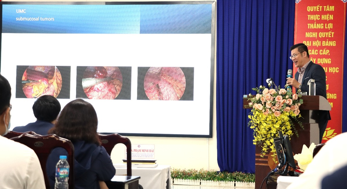 - Giới thiệu siêu âm nội soi (EUS) và báo cáo hoạt động của Hội Nội soi Tiêu hóa Can thiệp Việt Nam do TS.BS. Phạm Minh Hải – Phụ trách Trung tâm huấn luyện Phẫu thuật nội soi, Bệnh viện Đại học Y Dược thành phố Hồ Chí Minh, Đại diện Hội Nội soi tiêu hóa can thiệp Việt Nam trình bày.