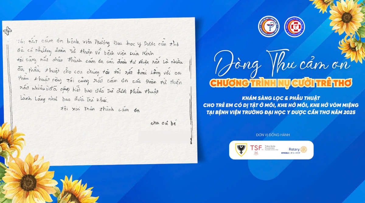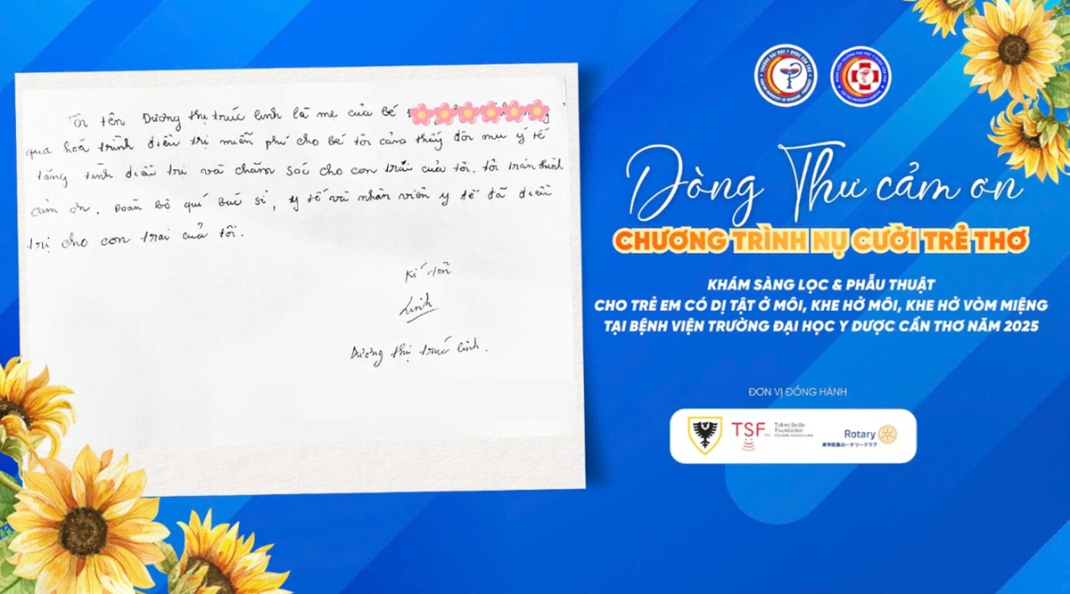 Bệnh viện Trường Đại học Y Dược Cần Thơ trân trọng gửi lời cảm ơn đến tất cả các gia đình, các tổ chức quốc tế và các nhân sự đã đồng hành để mang lại nụ cười mới cho các em nhỏ.