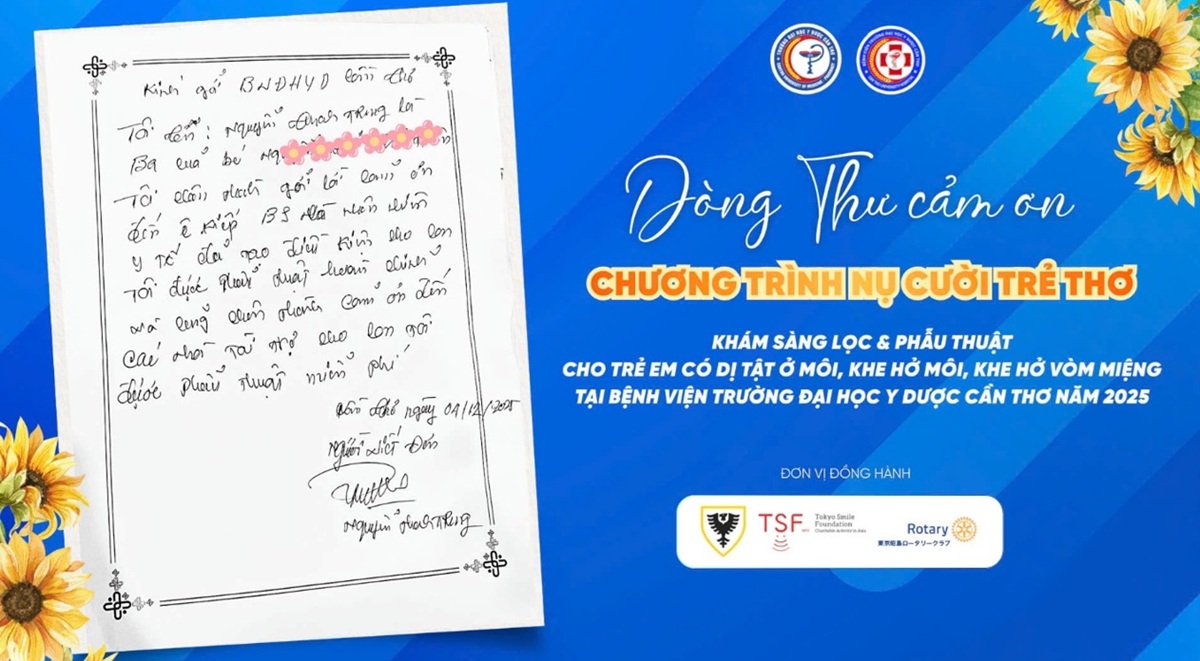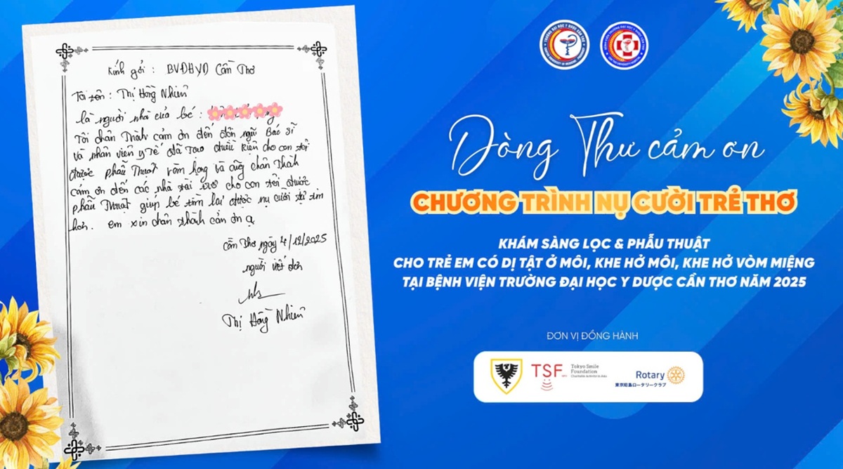 Trong khuôn khổ chương trình “Nụ cười trẻ thơ” diễn ra từ ngày 30/11 đến 04/12/2025 tại Bệnh viện Trường Đại học Y Dược Cần Thơ, các bác sĩ của Bệnh viện đã phối hợp cùng hai tổ chức quốc tế Quỹ Tokyo Smile và Đại học Dalhousie thực hiện khám sàng lọc và phẫu thuật miễn phí cho các em nhỏ có dị tật ở môi, khe hở môi, khe hở vòm miệng khắp các tỉnh thành của cả nước Việt Nam.
