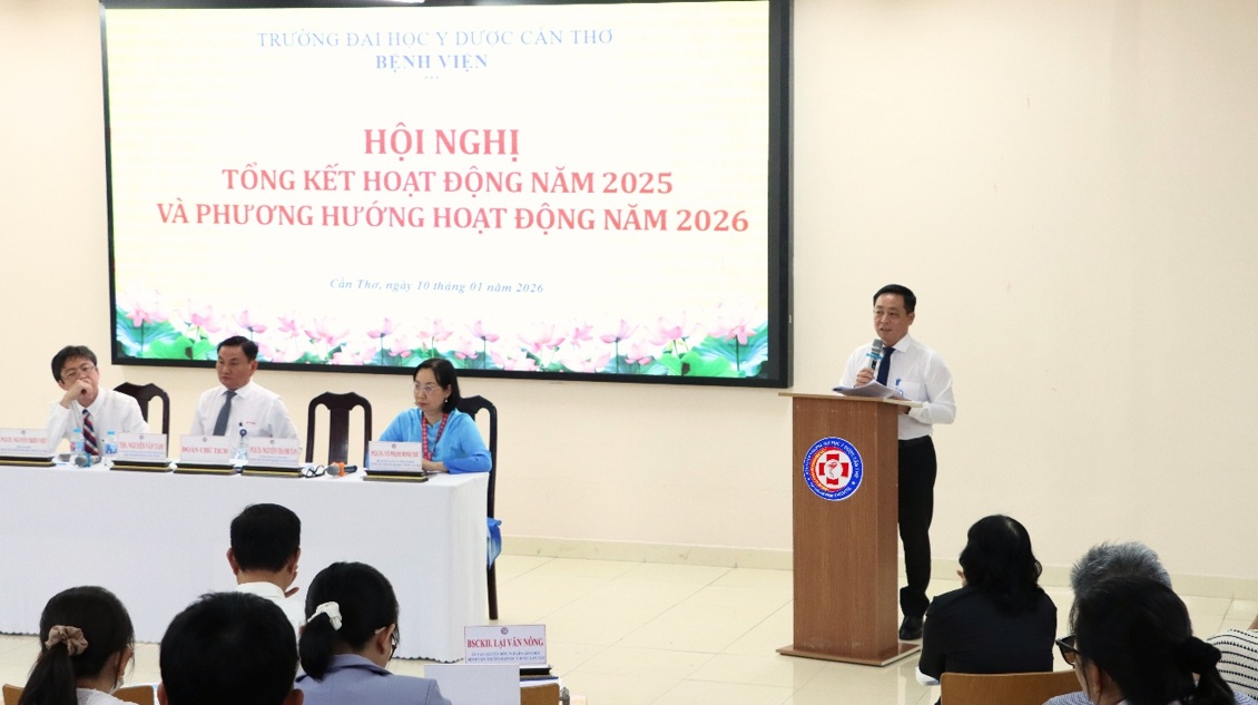 Ngày 10/01/2026, Bệnh viện Trường Đại học Y Dược Cần Thơ đã tổ chức Hội nghị tổng kết hoạt động năm 2025 và phương hướng hoạt động năm 2026. Đây là sự kiện quan trọng nhằm đánh giá toàn diện kết quả đã đạt được, tồn tại trong năm qua từ đó xác định mục tiêu, nhiệm vụ và giải pháp trọng tâm cho năm tới.