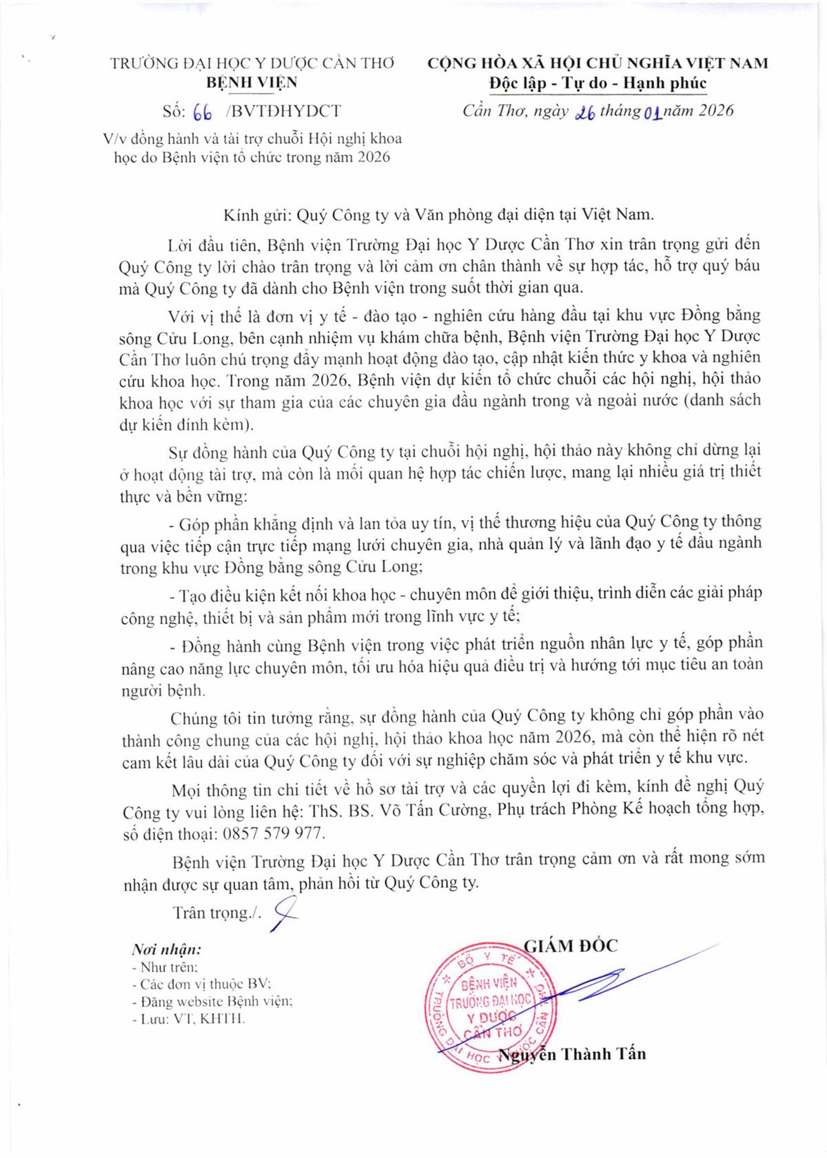 Để biết thêm chi tiết về hồ sơ tài trợ và quyền lợi tương ứng, kính mời quý đơn vị liên hệ ThS.BS. Võ Tấn Cường, Phụ trách Phòng Kế hoạch Tổng hợp, số điện thoại: 0857 579 977. Bệnh viện mong nhận được sự quan tâm và hợp tác từ các doanh nghiệp.