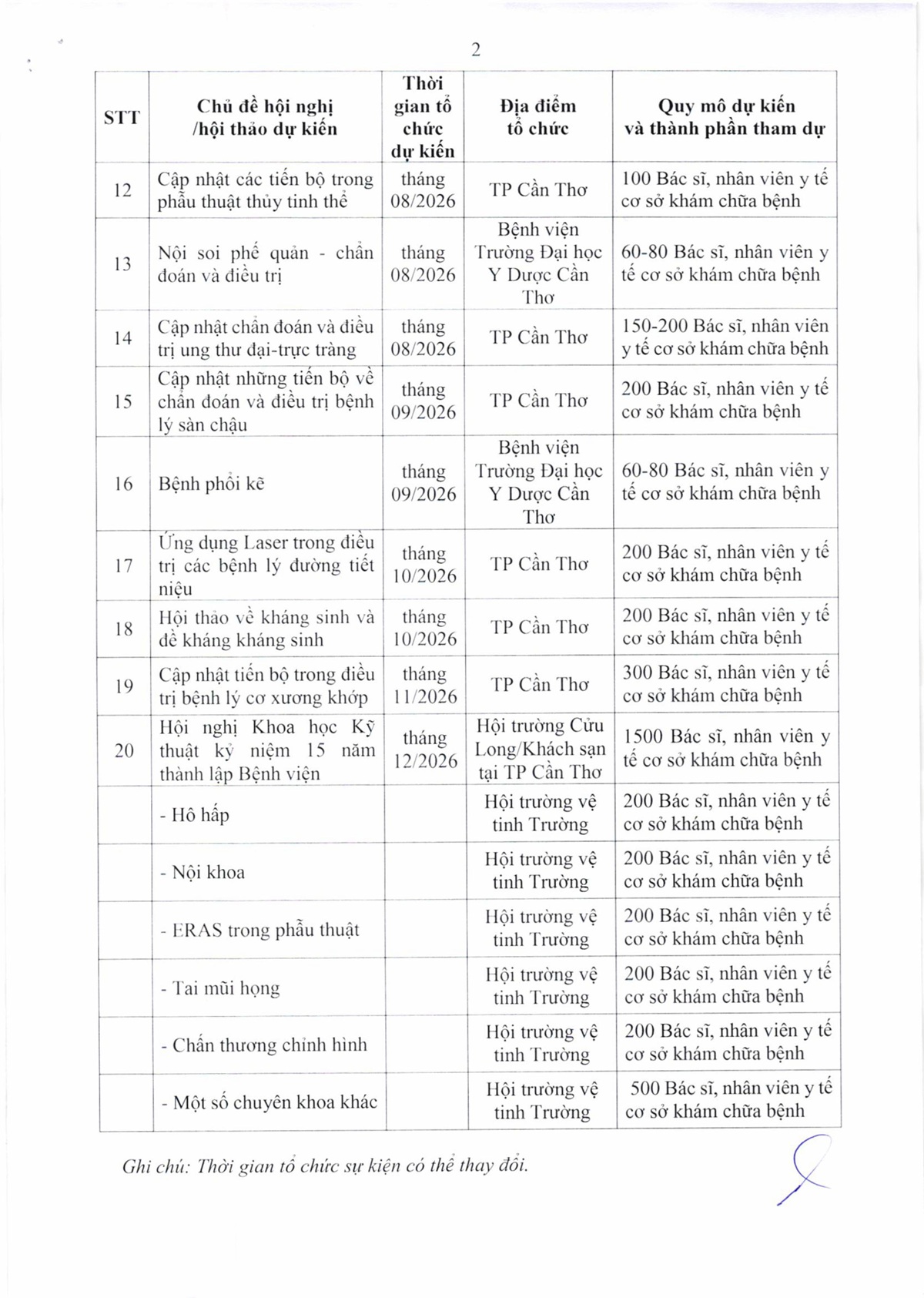 Với vai trò là đơn vị khám chữa bệnh – đào tạo – nghiên cứu trọng điểm tại khu vực Đồng bằng sông Cửu Long, Bệnh viện Trường Đại học Y Dược Cần Thơ luôn ưu tiên các hoạt động cập nhật kiến thức, chia sẻ kinh nghiệm lâm sàng và thúc đẩy đổi mới trong y học. Năm 2026, Bệnh viện dự kiến tổ chức chuỗi hội nghị, hội thảo khoa học với sự tham gia của các chuyên gia đầu ngành trong và ngoài nước. Chuỗi sự kiện có ý nghĩa đặc biệt với dấu mốc 15 năm thành lập Bệnh viện.