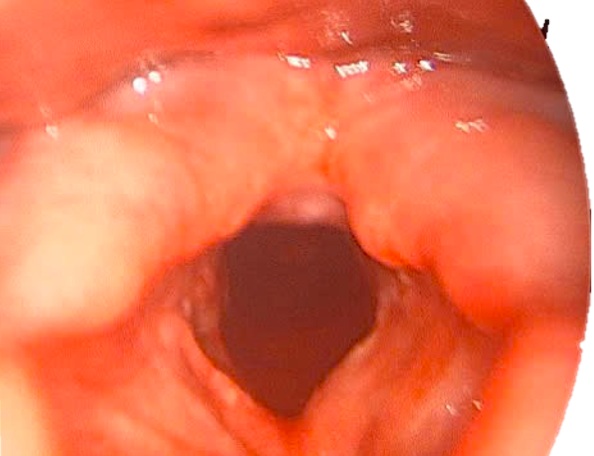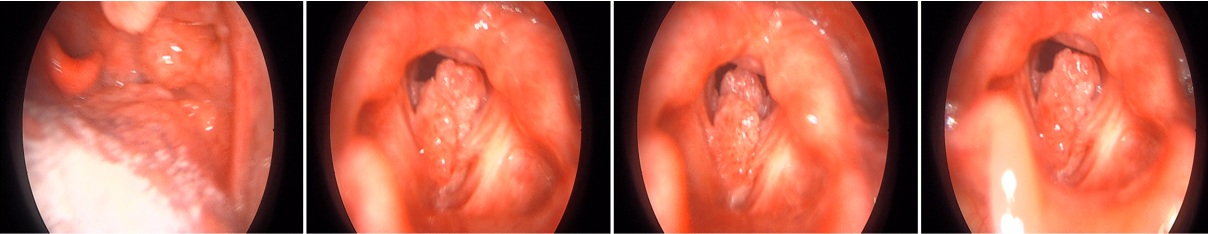 Nội soi họng: Khối papilloma màu hồng, dạng sùi nhiều thùy, bề mặt không chảy máu, chiếm gần trọn thanh môn.