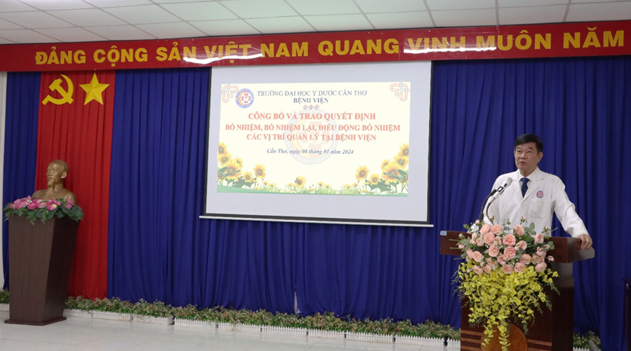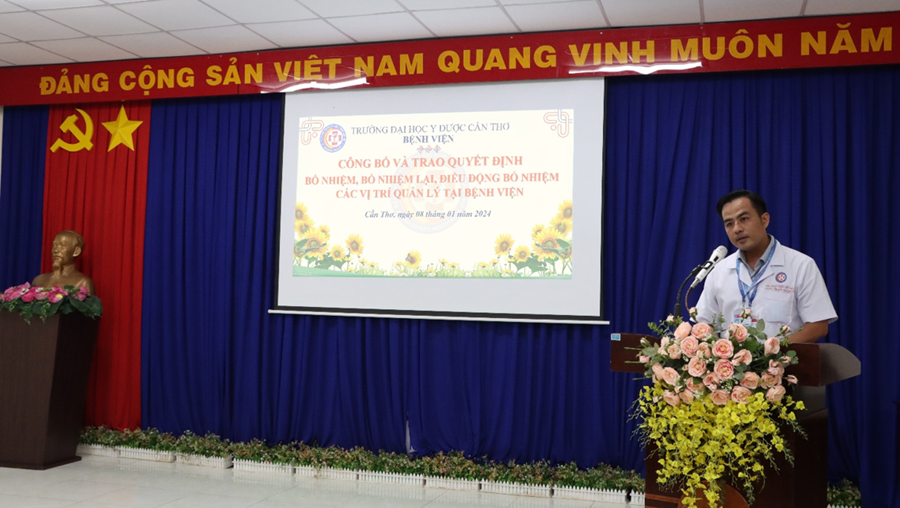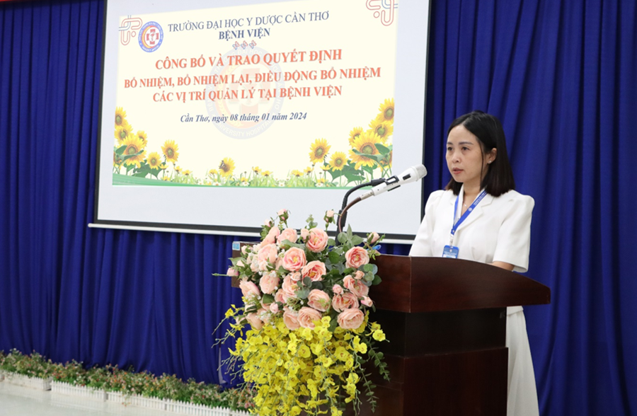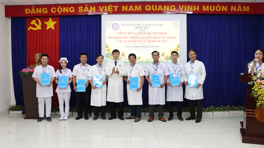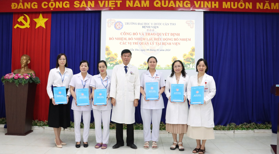 Thực hiện Nghị quyết số 72-NQ/ĐU ngày 21/12/2023 của Đảng ủy Bệnh viện về công tác cán bộ. Được sự đồng ý của Đảng ủy và Ban Giám đốc Bệnh viện, ngày 08/01/2024 Bệnh viện Trường Đại học Y Dược Cần Thơ đã tổ chức “Công bố và trao quyết định bổ nhiệm, bổ nhiệm lại, điều động bổ nhiệm các chức vụ quản lý tại các đơn vị thuộc Bệnh viện Trường Đại học Y Dược Cần Thơ”.