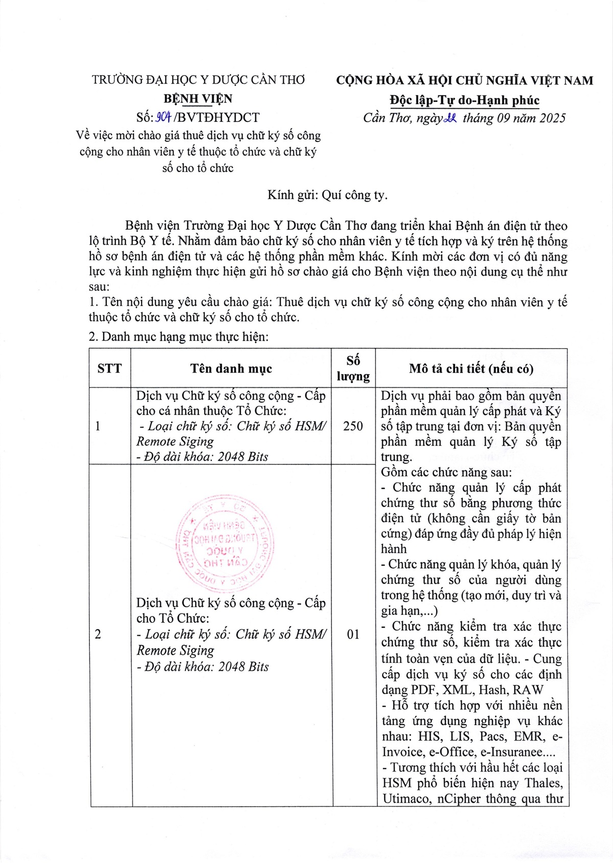 Về việc mời chào giá thuê dịch vụ chữ ký số công cộng cho nhân viên y tế thuộc tổ chức và chữ ký số cho tổ chức