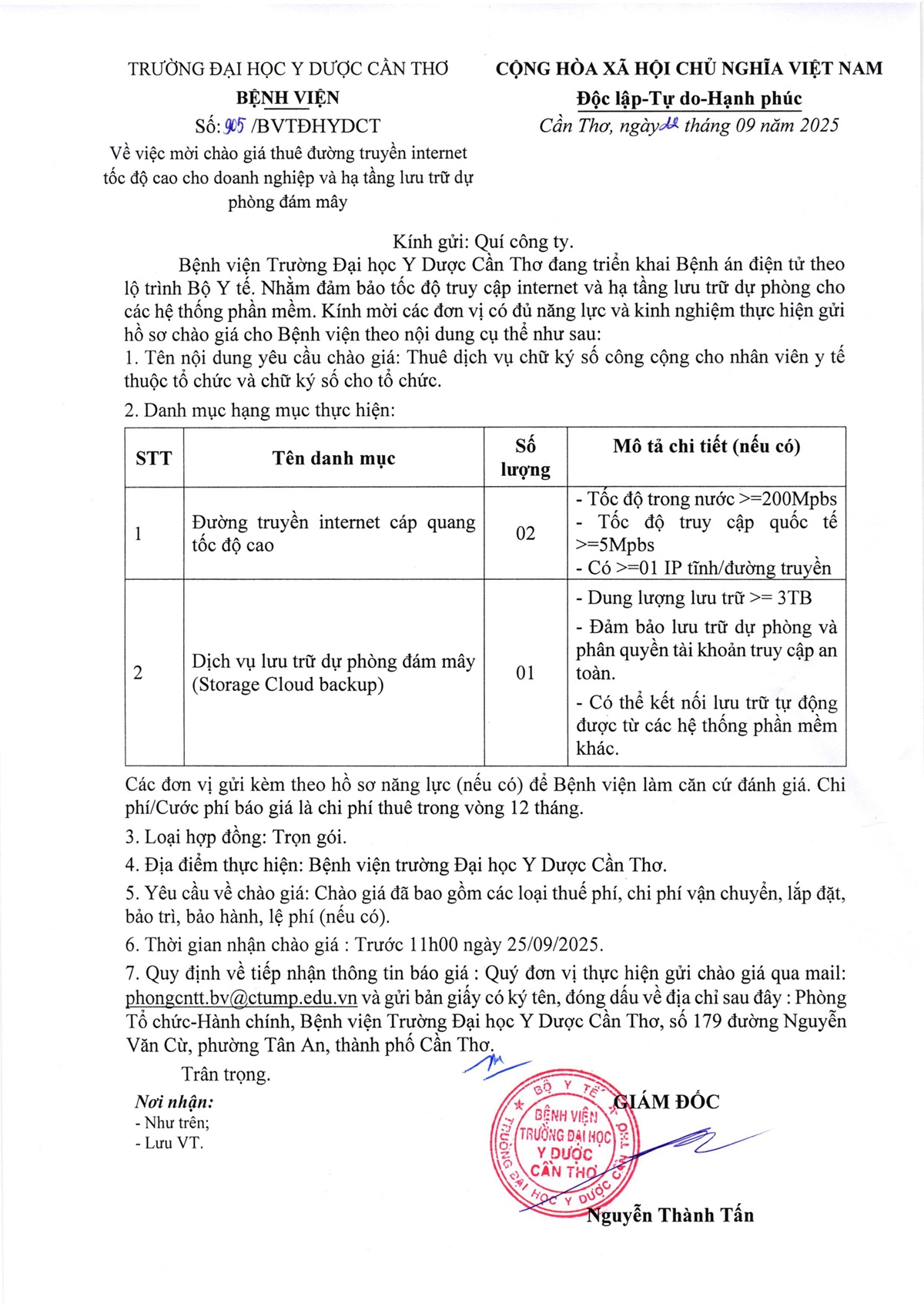 Về việc mời chào giá thuê đường truyền internet tốc độ cao cho doanh nghiệp và hạ tầng lưu trữ dự phòng đám mây