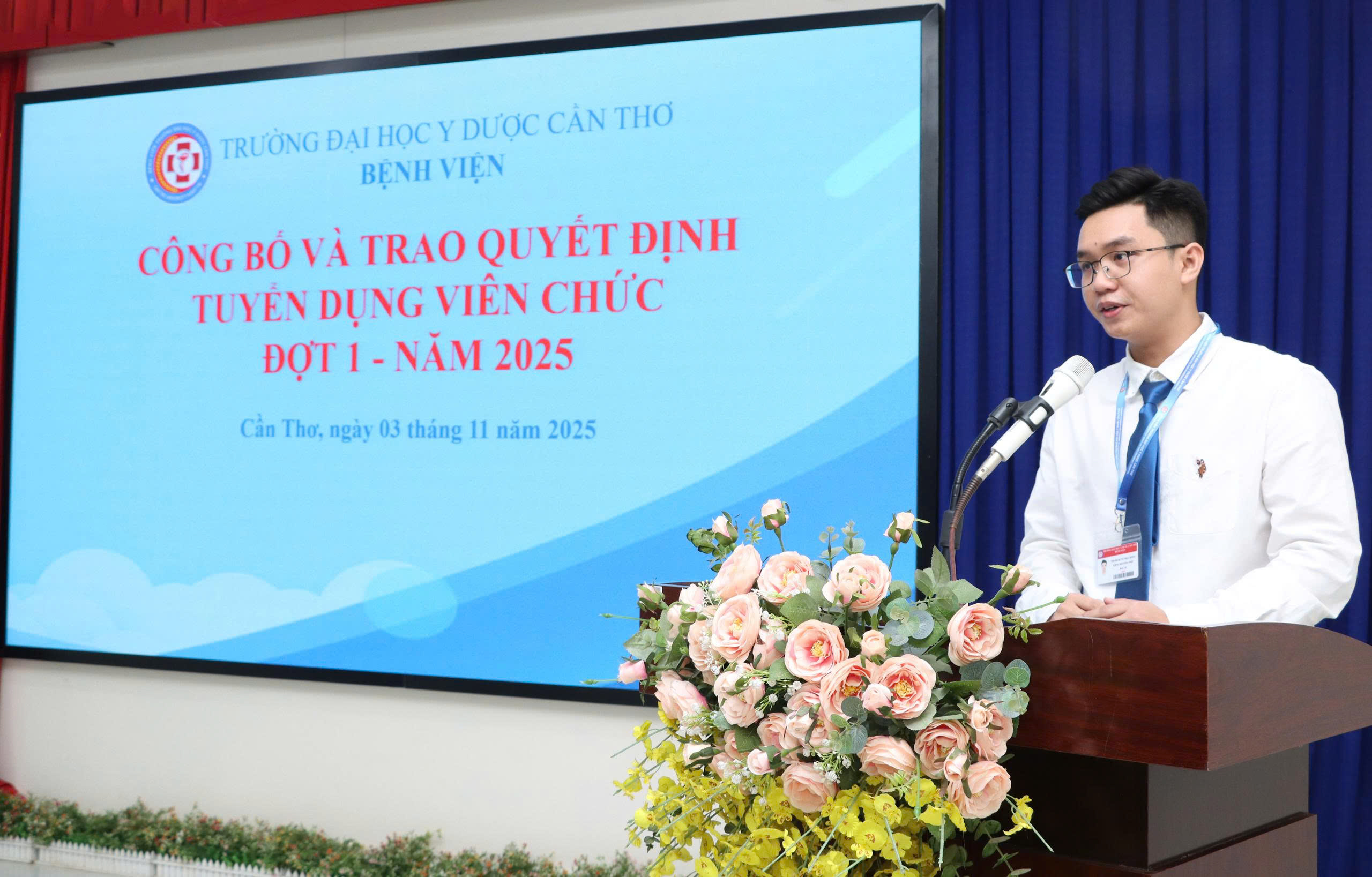 Đại diện cho các viên chức trúng tuyển BS. Võ Nhật Khoa đã có lời phát biểu bày tỏ niềm vinh dự và gửi lời cảm ơn tới Ban Lãnh đạo Bệnh viện. Tập thể viên chức mới hứa sẽ nỗ lực phấn đấu, phát huy kiến thức, năng lực để hoàn thành tốt nhiệm vụ được giao, góp phần vào sự phát triển chung của Bệnh viện.