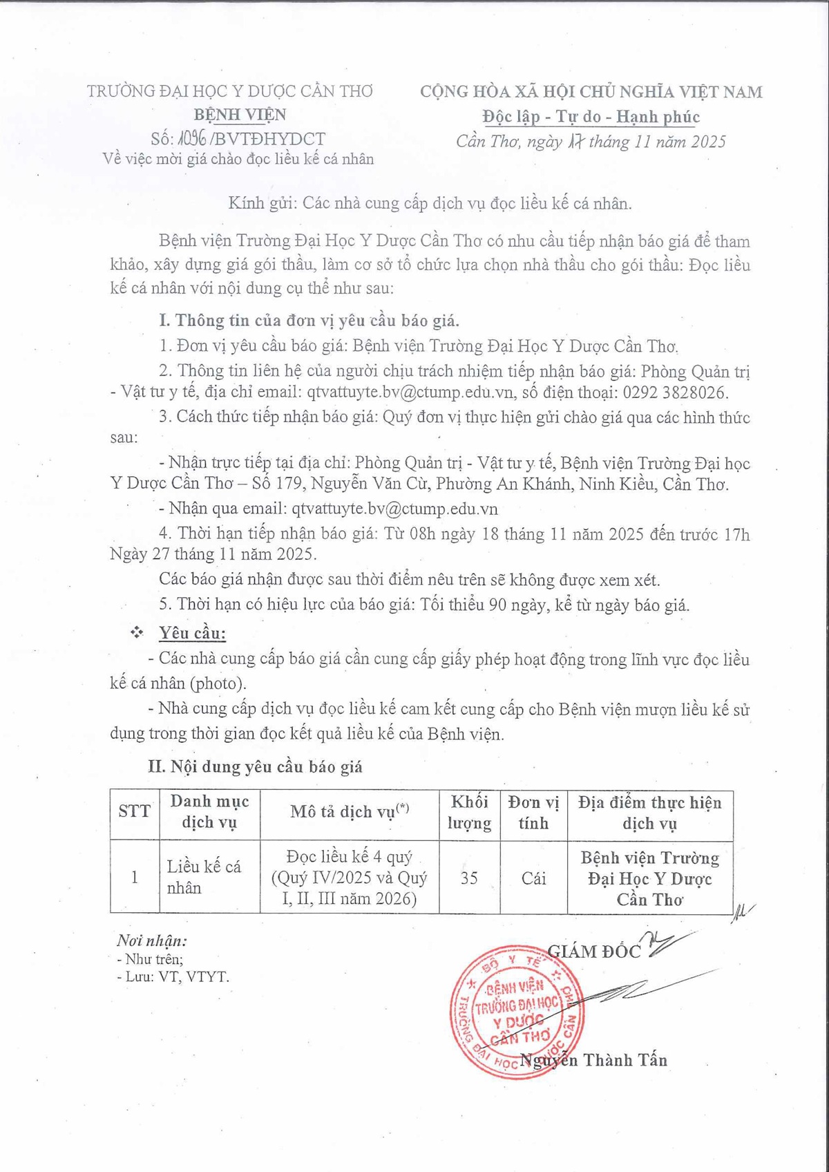 Bệnh viện Trường Đại học Y Dược Cần Thơ có nhu cầu tiếp nhận báo giá để