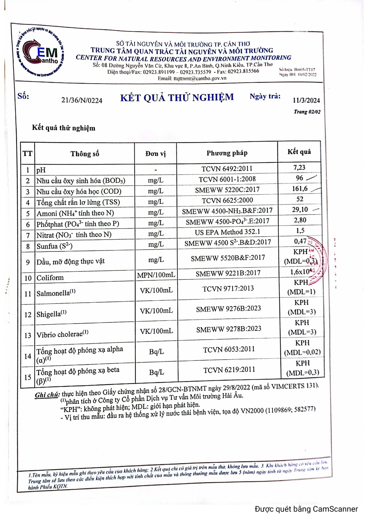 Kết quả quan trắc nước thải đột xuất năm 2024 của Bệnh viện Trường Đại học Y Dược Cần Thơ