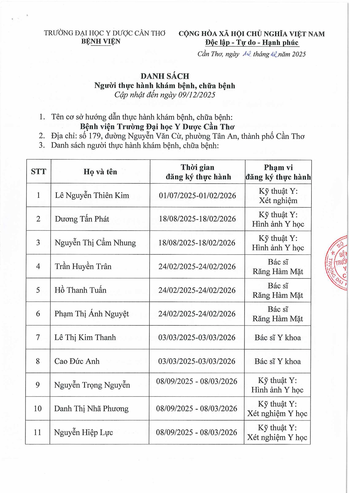 Danh sách người thực hành khám bệnh, chữa bệnh, cập nhật đến ngày 09/12/2025.