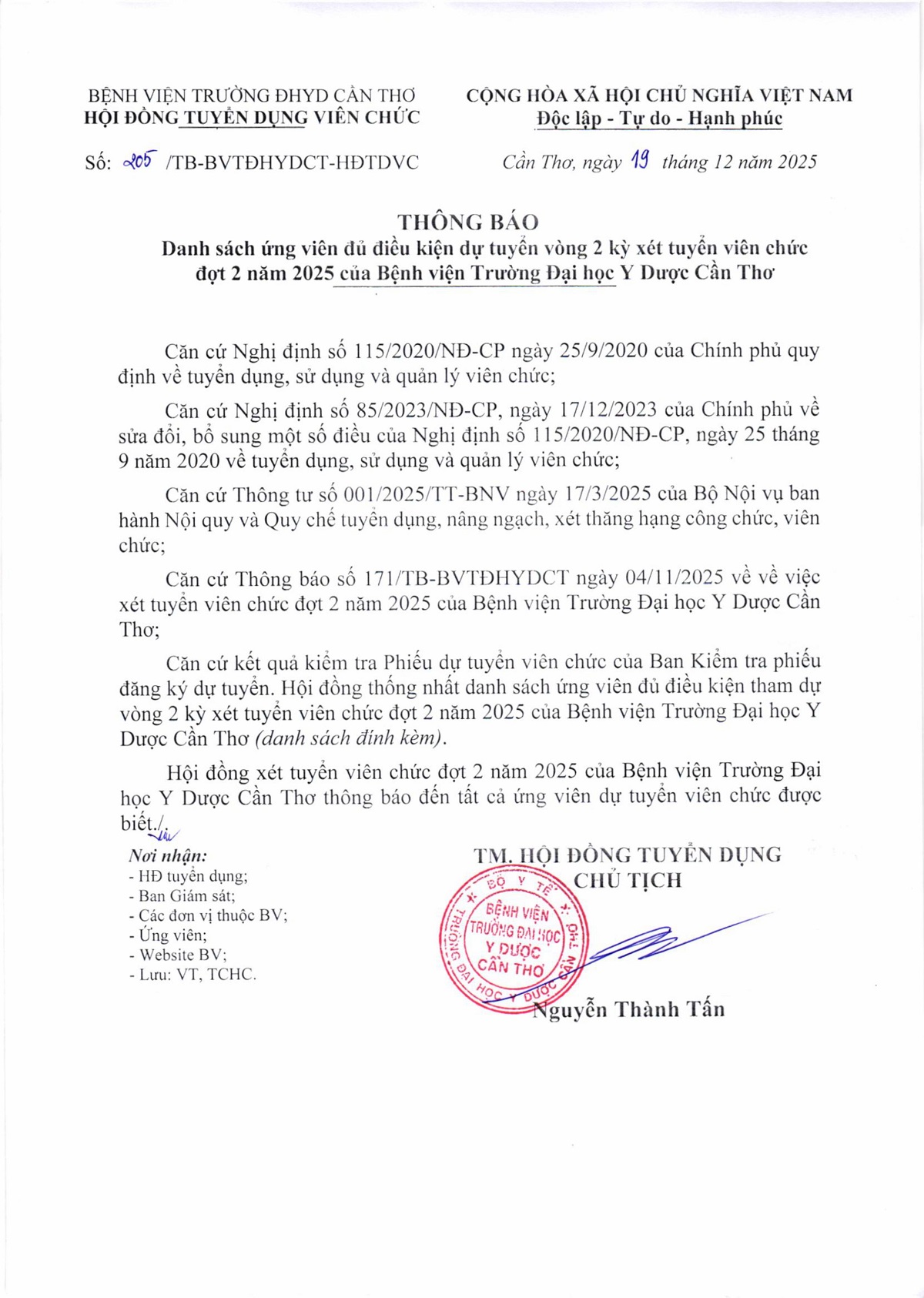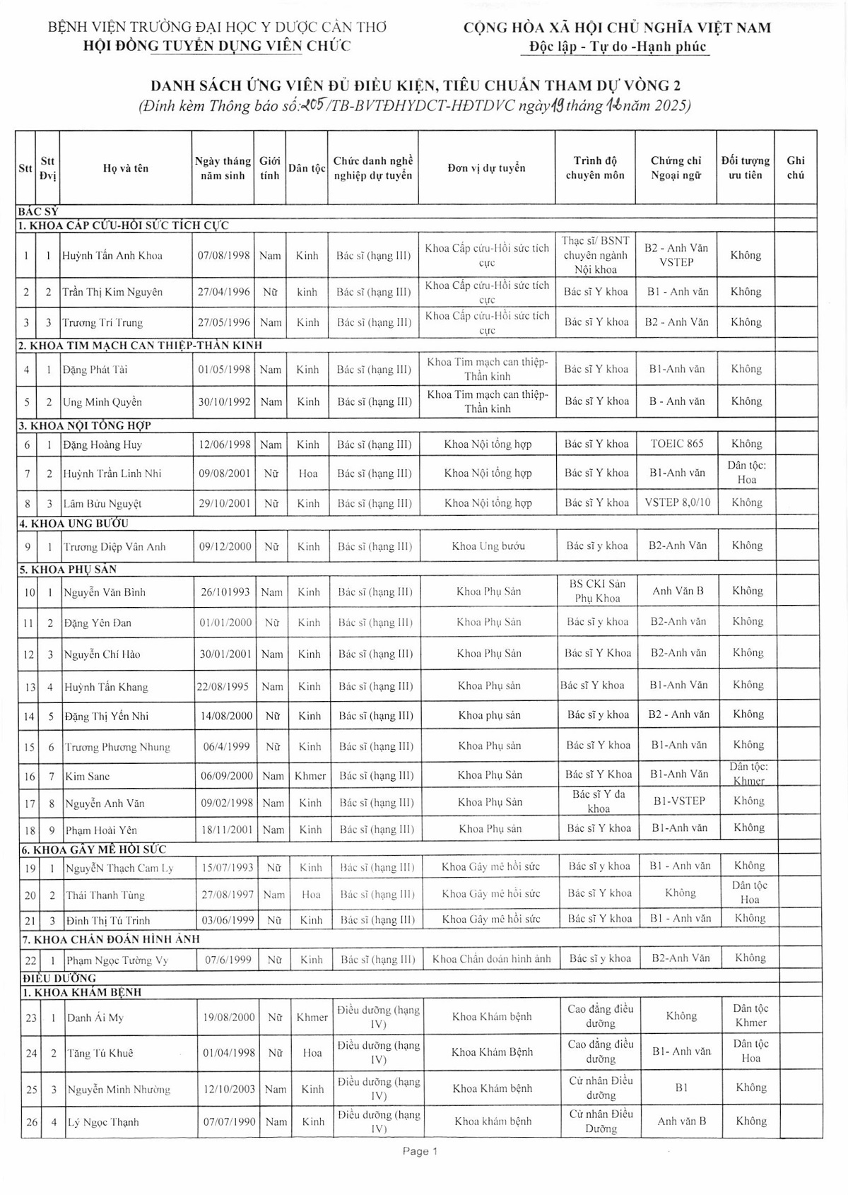 Thông báo số 205 danh sách ứng viên đủ điều kiện dự tuyển vòng 2 kỳ xét tuyển viên chức đợt 2 năm 2025 của Bệnh viện Trường Đại học Y Dược Cần Thơ