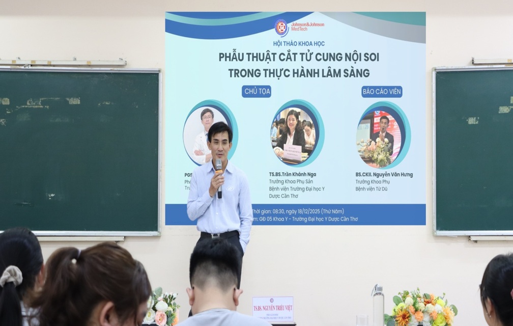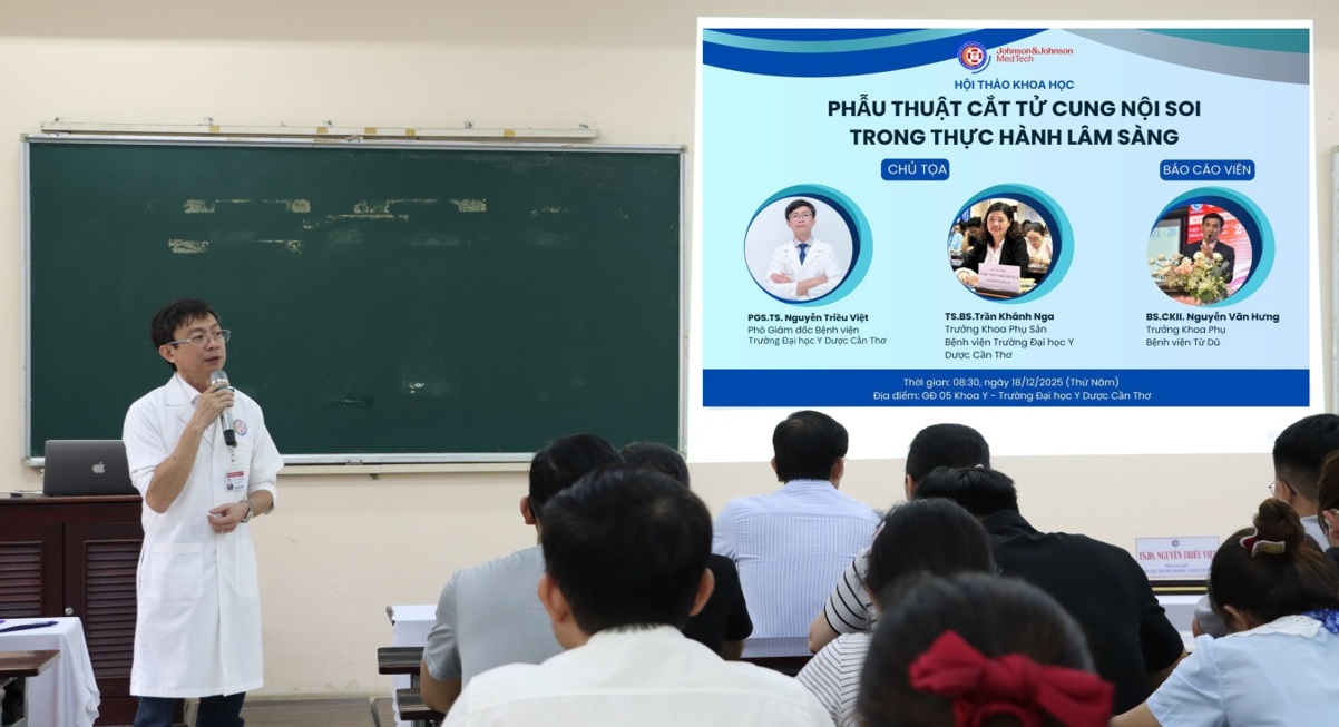 Ngày 18 và 22 tháng 12 năm 2025, Bệnh viện Trường Đại học Y Dược Cần Thơ đã tổ chức hội thảo chuyên đề “Phẫu thuật cắt tử cung nội soi trong thực hành lâm sàng”. Chương trình thuộc chuỗi hoạt động khoa học – công nghệ thường niên của Bệnh viện, hướng đến mục tiêu cập nhật kiến thức, nâng cao năng lực chuyên môn cho đội ngũ y bác sĩ và học viên đang công tác, học tập tại đơn vị.