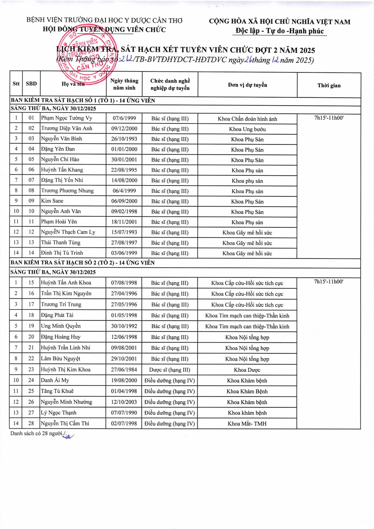 Thông báo số 212 thời gian và địa điểm ứng viên tham dự kiểm tra, sát hạch kỳ xét tuyển viên chức đợt 2 năm 2025 của Bệnh viện Trường Đại học Y Dược Cần Thơ