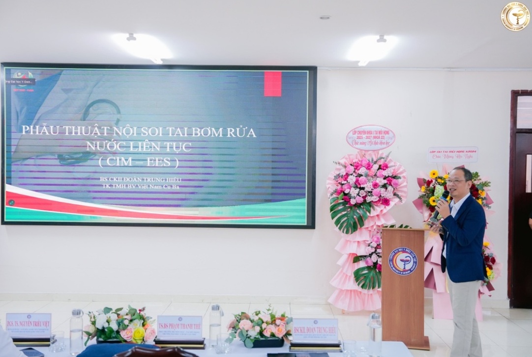BS.CKII. Đoàn Trung Hiếu – Trưởng khoa TMH, Bệnh viện Việt Nam - Cuba trình bày về: “Ứng dụng kỹ thuật phẫu thuật nội soi tai vá nhĩ đơn thuần”