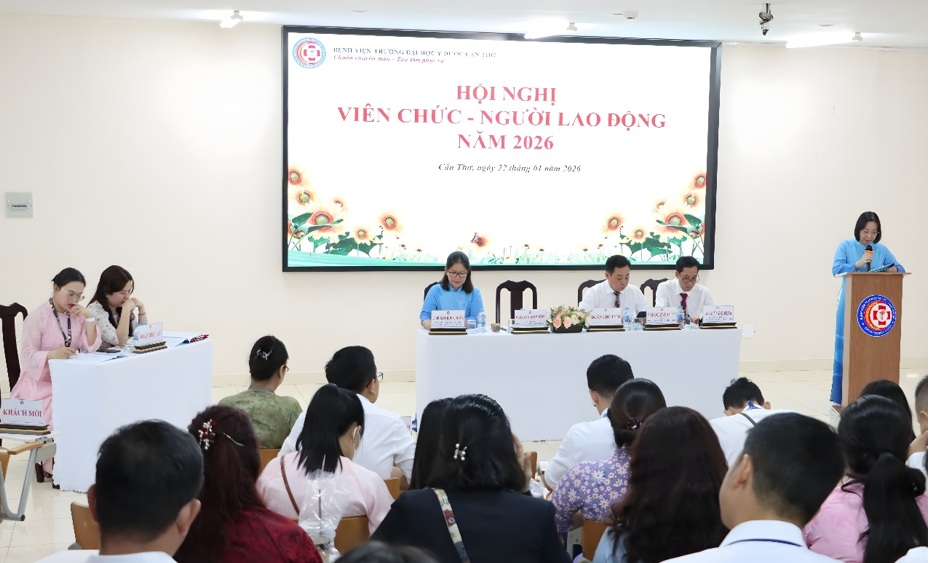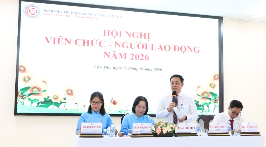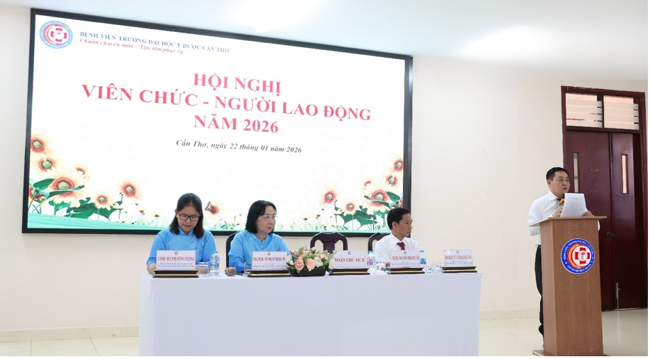Chiều ngày 22/01/2026, Bệnh viện Trường Đại học Y Dược Cần Thơ đã diễn ra Hội nghị viên chức – người lao động năm 2026. Hội nghị được tổ chức nhằm phát huy tính dân chủ cơ sở. Đảm bảo quyền và lợi ích hợp pháp, chính đáng của viên chức, người lao động. Đồng thời tạo sự thống nhất, đồng thuận trong việc thực hiện nhiệm vụ của đơn vị.