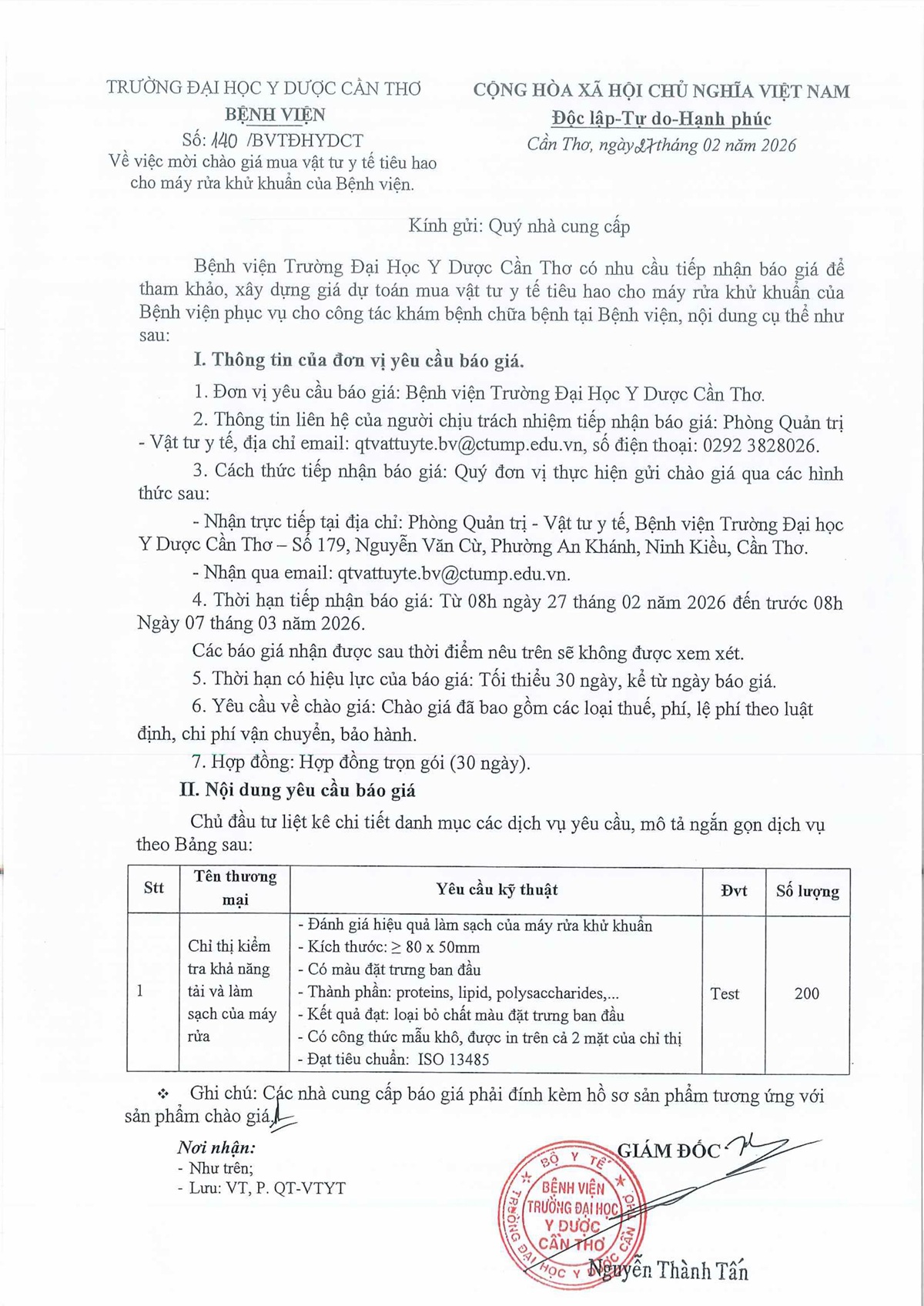 Về việc mời chào giá mua vật tư y tế tiêu hao cho máy rửa khử khuẩn của Bệnh viện