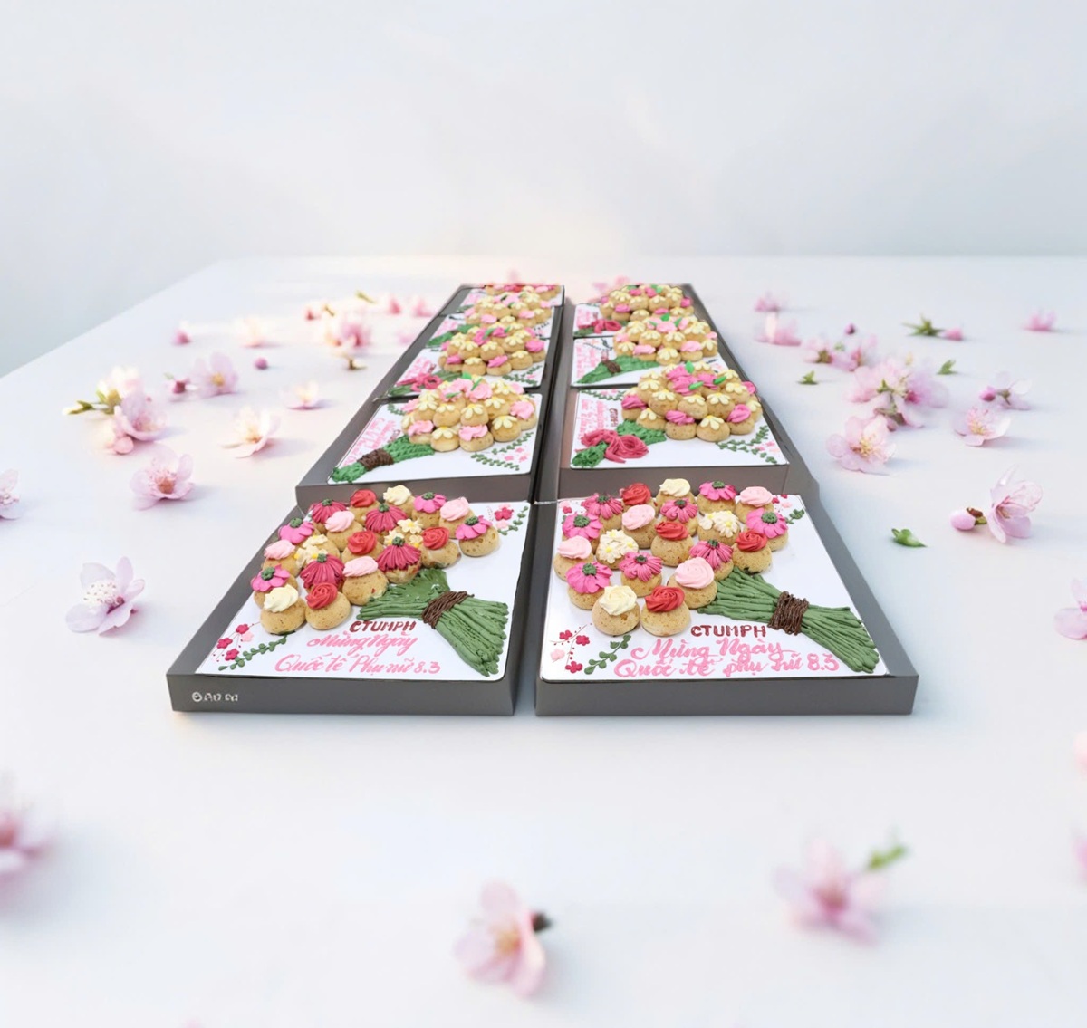 Nhân dịp này, Ban Chấp hành Công đoàn đã gửi tặng đến các nữ công đoàn viên những bó hoa đặc biệt được kết từ bánh su kem. Những chiếc bánh nhỏ xinh được khéo léo tạo hình thành bó hoa rực rỡ, vừa mang hương vị ngọt ngào vừa thể hiện sự trân trọng và những lời chúc tốt đẹp dành cho chị em phụ nữ trong ngày đặc biệt.