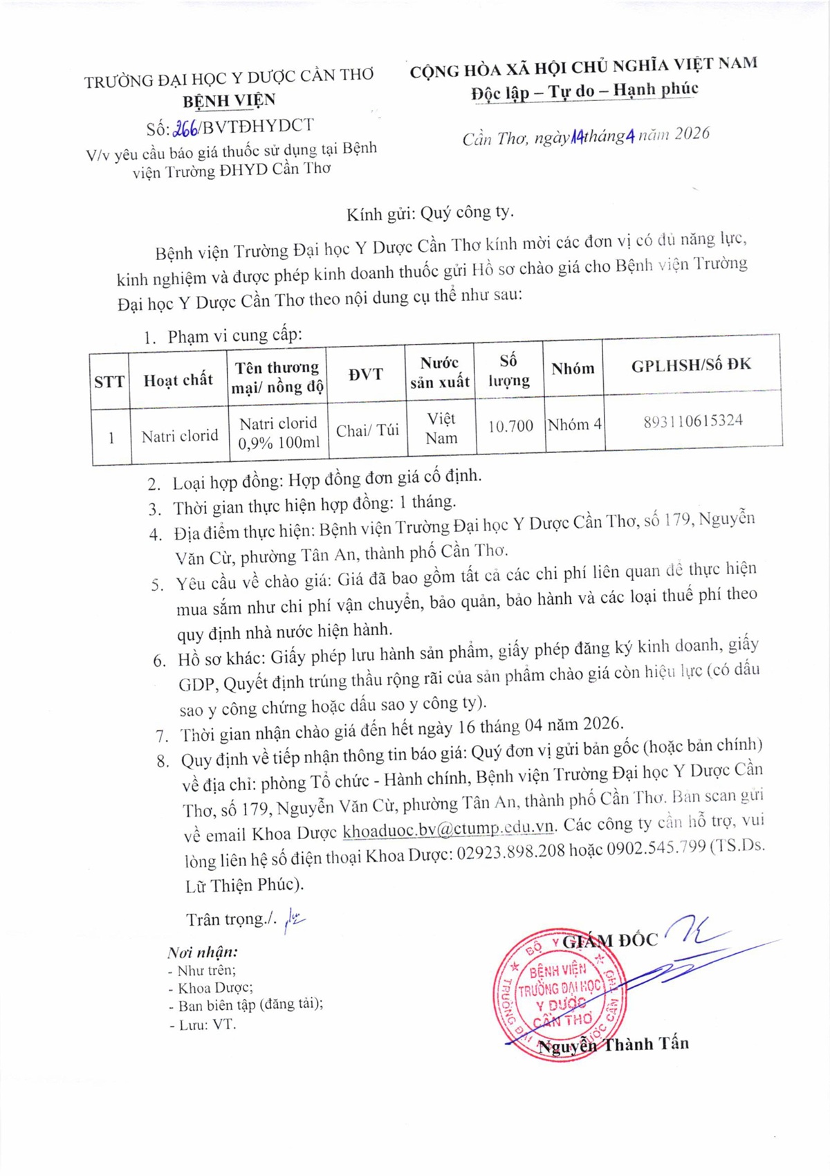 Về việc yêu cầu báo giá thuốc sử dụng tại Bệnh viện Trường Đại học Y Dược Cần Thơ