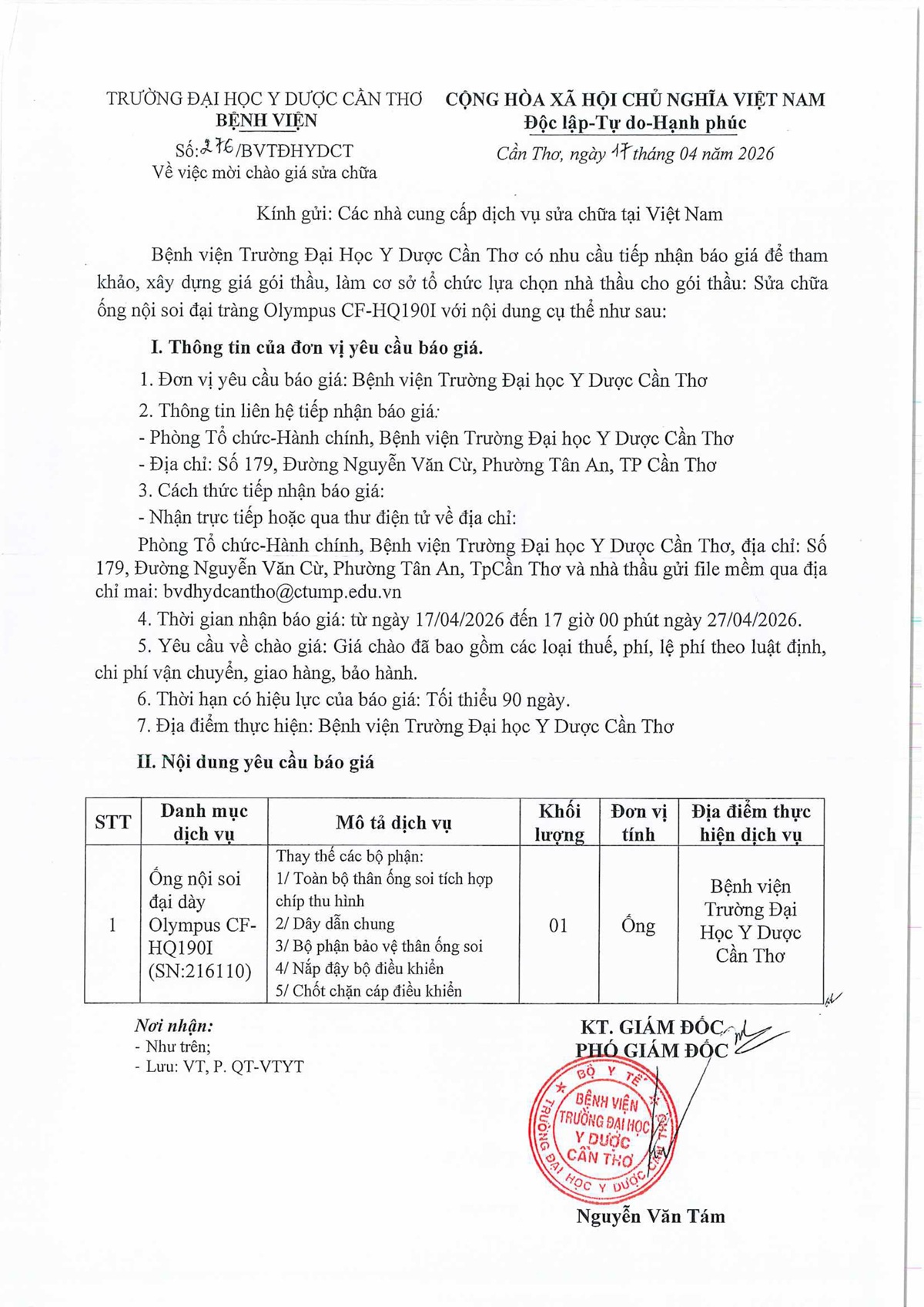 Về việc yêu cầu báo giá thuốc sử dụng tại Bệnh viện Trường Đại học Y Dược Cần Thơ