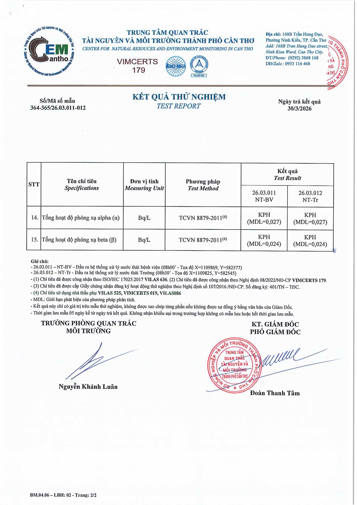 Kết quả quan trắc nước thải quý 1 năm 2026 của Bệnh viện Trường Đại học Y Dược Cần Thơ