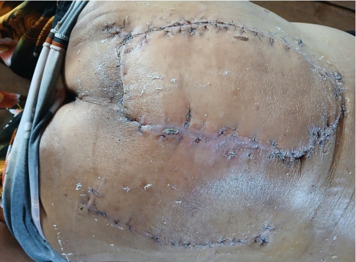 Giai đoạn che phủ vết loét: Khi vết thương đã sạch và tình trạng toàn thân cải thiện, ê-kíp phẫu thuật tiến hành tạo hình che phủ bằng kỹ thuật xoay vạt da Keystone. Sau khi xử lý triệt để tổn thương, khuyết hổng thực tế lớn hơn so với ban đầu. Các bác sĩ đã thiết kế và xoay vạt da tại chỗ để che phủ hoàn toàn vùng tổn thương, giúp bảo tồn mô lành xung quanh và đảm bảo nuôi dưỡng tốt cho vùng da ghép.