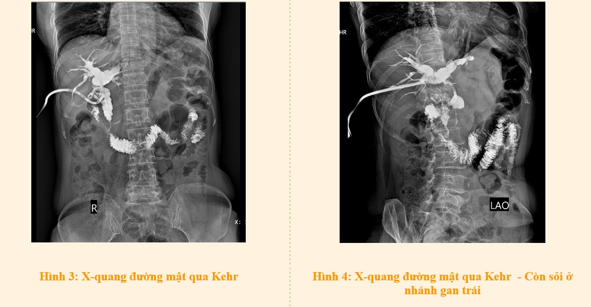 Sau phẫu thuật, bệnh nhân hồi phục tốt, bụng mềm, ống dẫn lưu Kehr hoạt động tốt. Kết quả chụp đường mật qua Kehr sau mổ còn ghi nhận khuyết thuốc cản quang ở đường mật nhánh gan trái. Bệnh nhân được xuất viện sau 5 ngày với tình trạng ổn định, mang theo ống Kehr và được hướng dẫn chăm sóc tại nhà, hẹn tái khám để kiểm tra và xử lý sỏi ở nhánh gan trái.