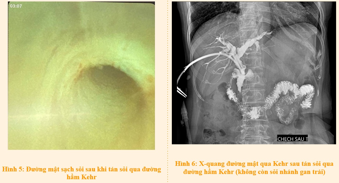 Bệnh nhân được thực hiện nội soi mở ống mật chủ lấy sỏi và soi đường mật trong mổ. Sau khi giải quyết sạch sỏi đoạn cuối ống mật chủ, vì cuộc mổ kéo dài và sỏi nhánh gan trái chưa gây tắc mật, phần sỏi còn lại này được chỉ định xử trí bằng tán sỏi qua đường hầm Kehr sau mổ.