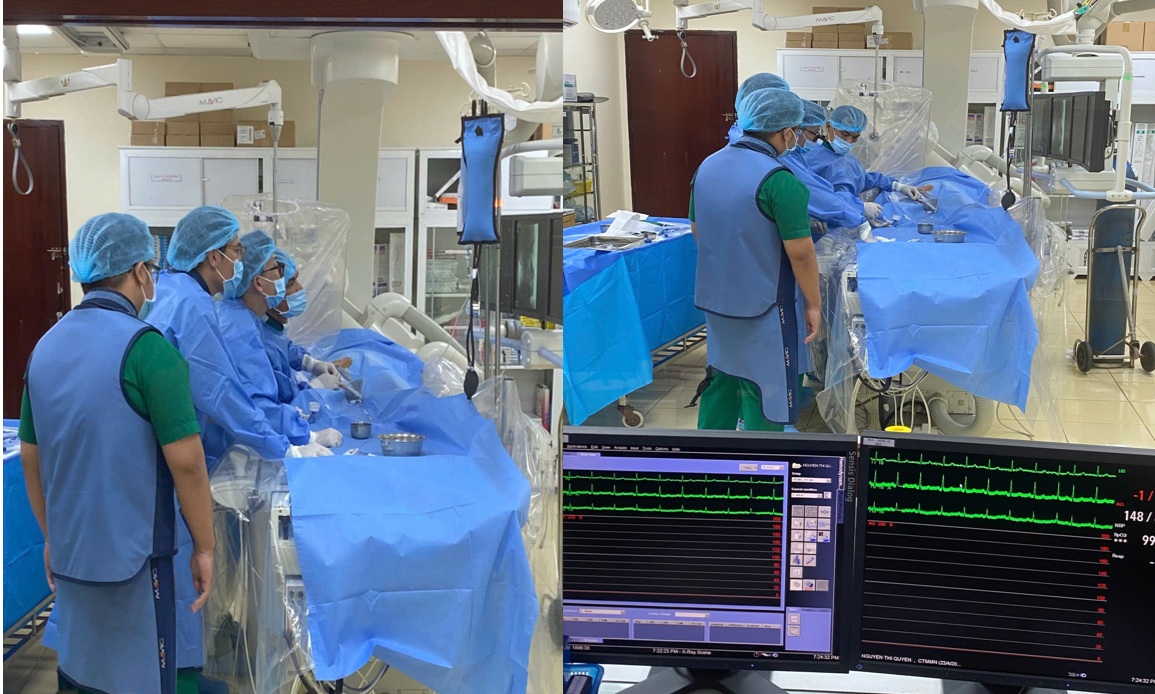 TS.BS. Nguyễn Vũ Đằng-Trưởng khoa Chẩn đoán hình ảnh cùng ê-kíp đang thực hiện kĩ thuật can thiệp stent điều trị hẹp động mạch cảnh cho bệnh nhân Nguyễn Thị Q.
