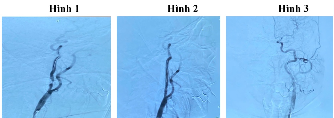 Hình ảnh hẹp động mạch cảnh trong ở bệnh nhân Nguyễn Thị Q trước (hình 1) và sau can thiệp (hình 2, 3)