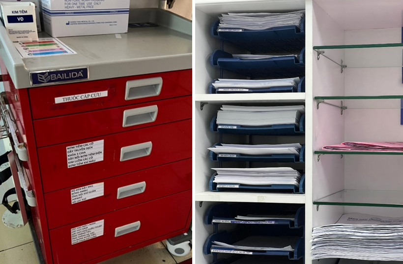 Xe tiêm được mã hóa cụ thể và tủ hồ sơ bệnh án được lưu trữ gọn gàng,
